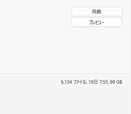 ※ ファイル数が多い場合や、容量が100GBを超えるとかなり時間がかかる場合があるので、PCを触らないタイミングで「同期」を実施することをお勧めします。